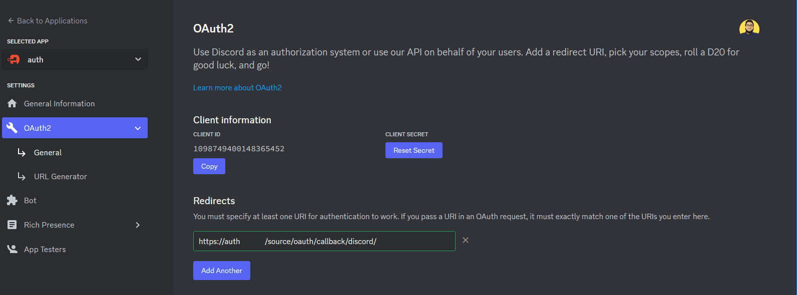 Here is an example of a completed OAuth2 screen for Discord.