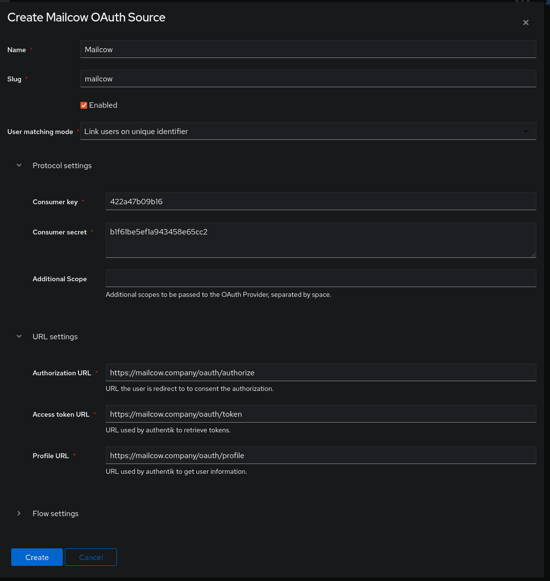 - Under Directory > Federation & Social login click Create > Mailcow OAuth Source