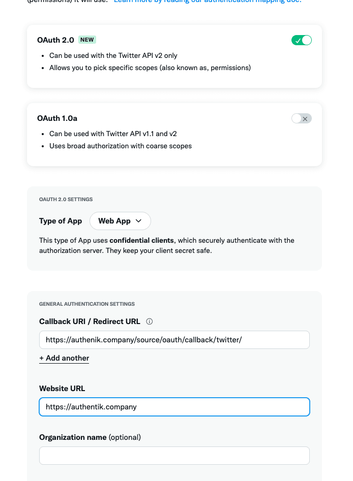 https://authentik.company/source/oauth/callback/twitter/ - Set Website URL to